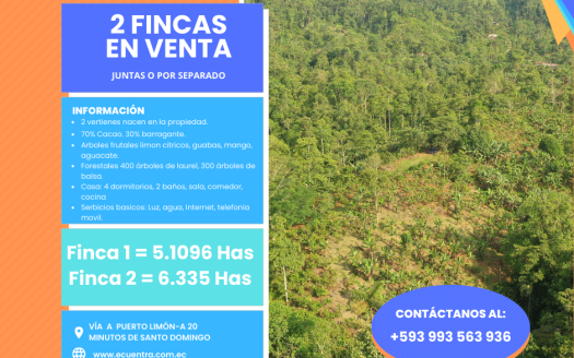 Finca 1 = 5.1096 HasFinca 2 = 6.335 Has. Precio: 21000 USD/Has negociables A 20 minutos de Santo Domingoen la via a Puerto Limon, 2 vertientes nacen en la propi ...